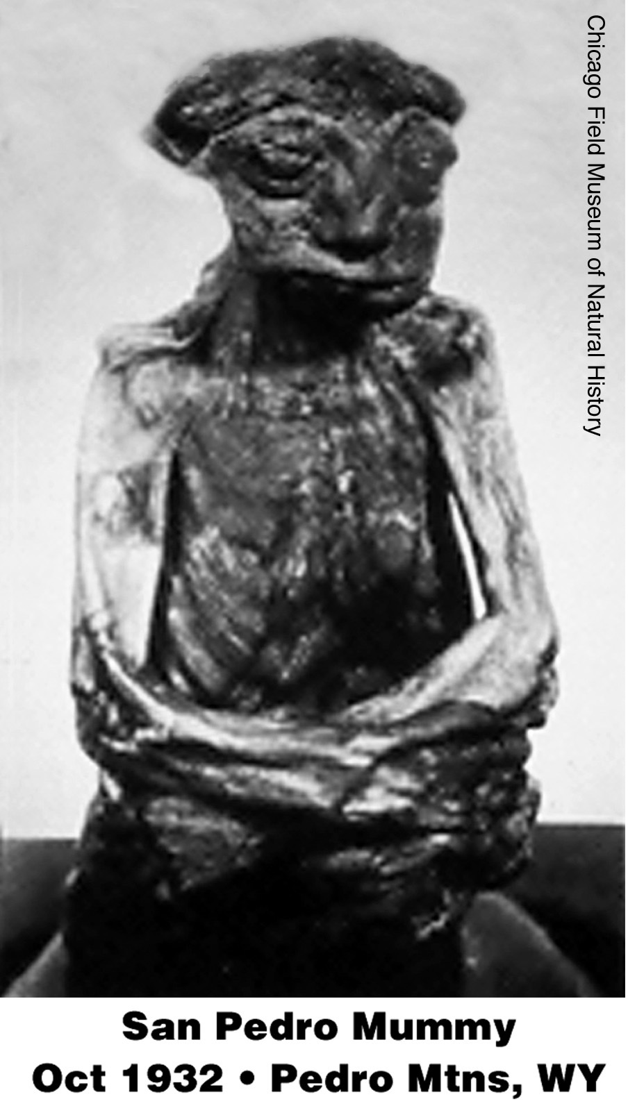 In October of 1932, two men were prospecting for gold in the Pedro Mountains of Wyoming when they found the mummified remains of what appeared to be a mature adult male. The miners were blasting near a stone-walled gulch, and when the dust settled they found the opening of a small cave about 4 feet tall, 4 feet wide, and about 15 feet deep. Inside they found the 14-inch tall San Pedro mummy (It was around 7 inches tall sitting, and 14 inches tall (estimated) standing), as it is now called, weighing about 12 ounces, with its arms and legs crossed, leaning perpendicularly upon a small ledge. According to the authorities, it did not appear to be the body of an infant because of the well-developed and proportional head, which would have been proportionally larger if it had been an infant. It had a broad, thin-lipped mouth, the nose was short and broad, the forehead was flattened, and the skin was a deeply-wrinkled dark brown.